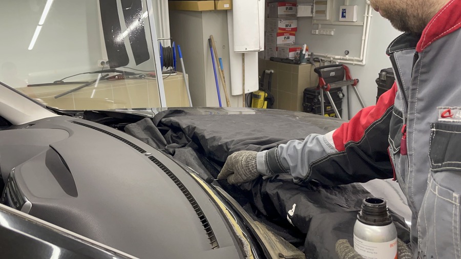 Пока праймер высыхает, эксперт по монтажу как раз успевает подготовить полиуретановый герметик, заправив его в пистолет. Этот этап точно вписывается в технологический процесс. Параллельно решаются и другие задачи, например, окончательно очищается и обезжиривается рабочая зона на стекле, куда будет нанесен клей. Сколько нужно герметика для вклейки лобового стекла, также решается на этой стадии – нужный объем зависит от ширины и глубины шва и строго регламентирован производителем системы.
